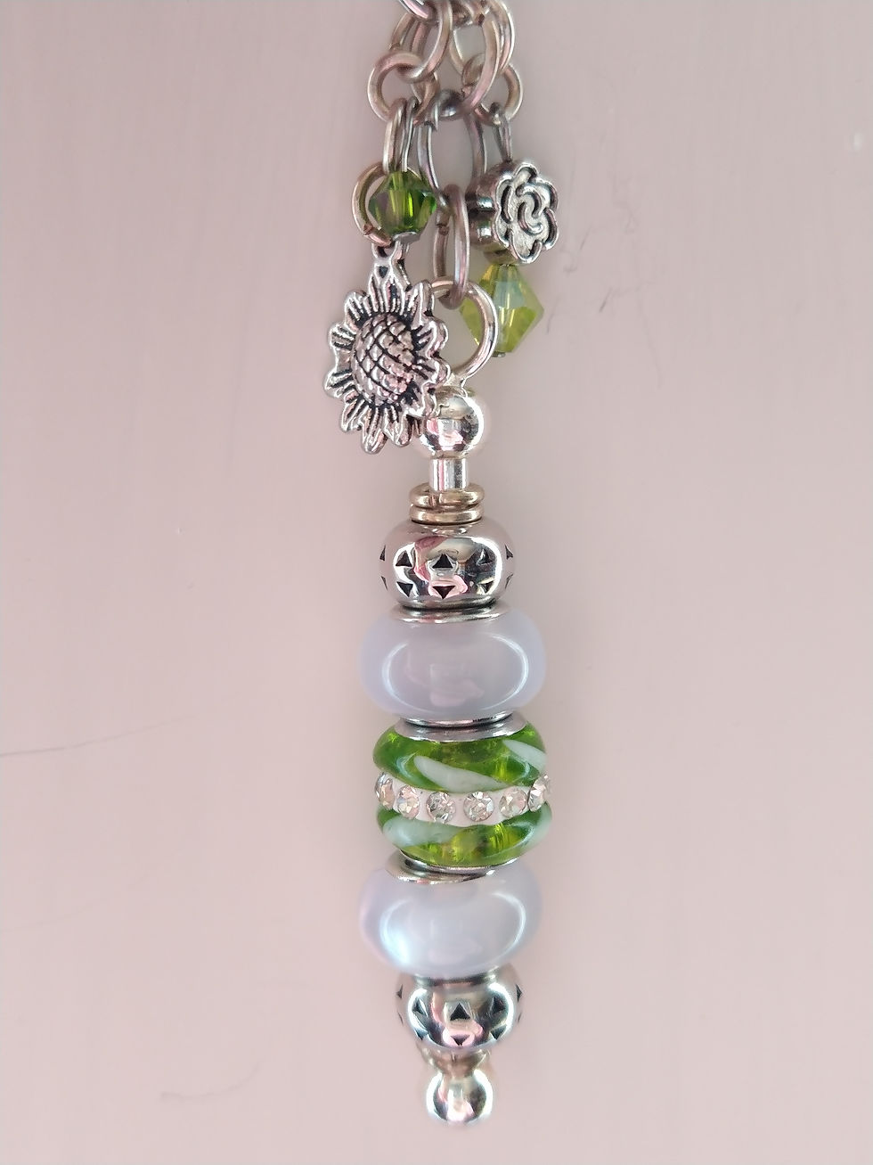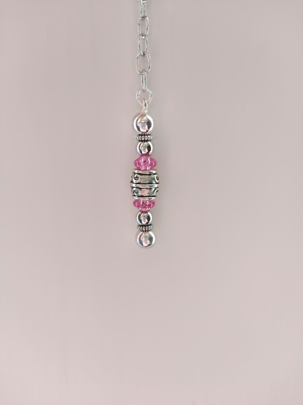 If you love anything pink and sparkly - this is for you! Gorgeous pink haze Czech glass large hole beads, large pink Rondelle, 2 small clear glass Rondelles, and Tibetan silver findings with a Swarovski pink butterfly charm and silver plated Dragonfly charm. Can be used as a key ring or a purse charm.